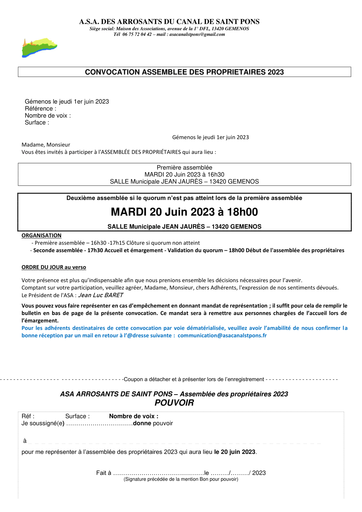 Veuillez trouver ici la convocation ainsi que le pouvoir à donner si vous ne pouvez pas venir, et là l'ordre du jour.