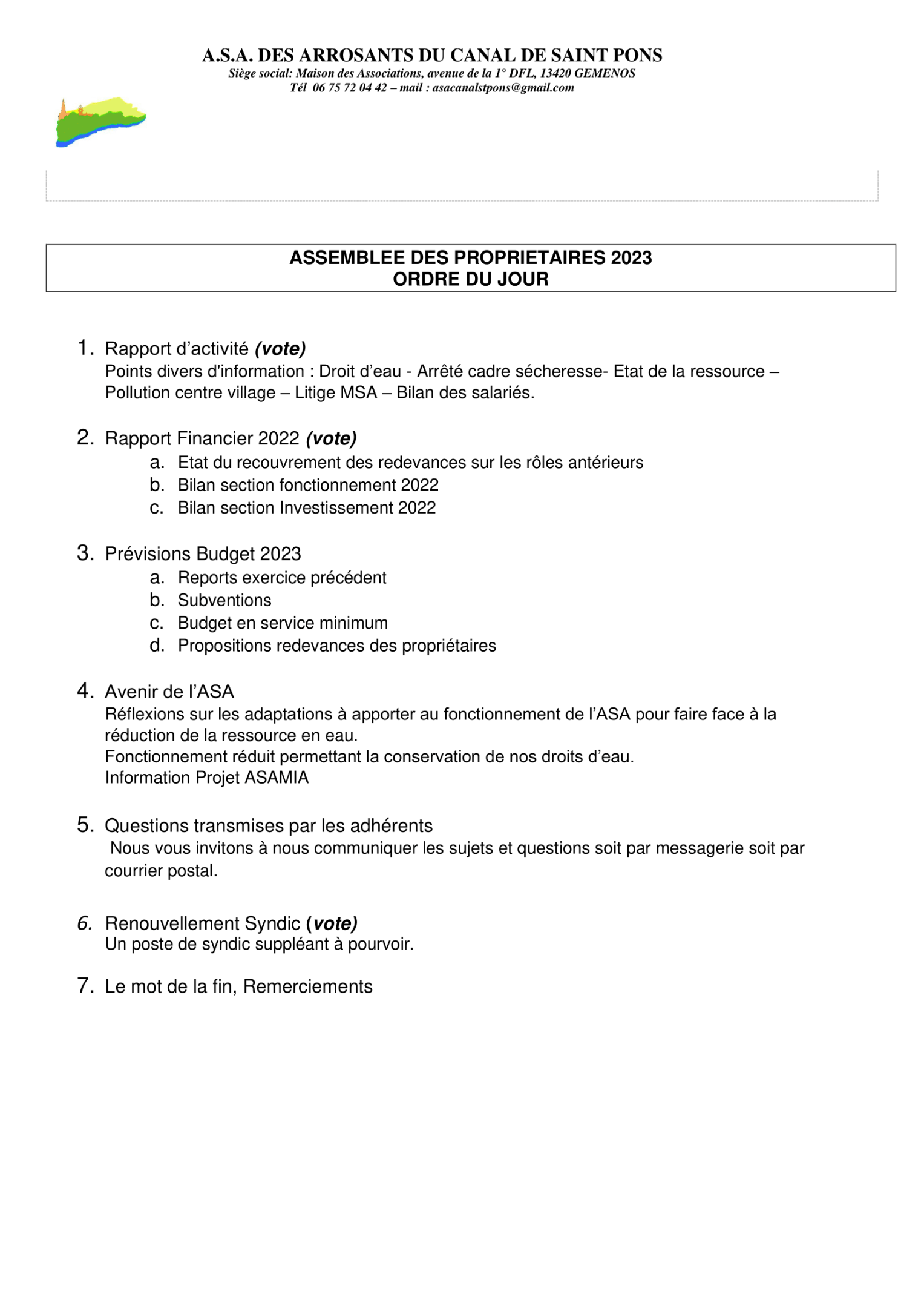 Vous pouvez trouver ci-joint le compte-rendu de l'Assemblée des Propriétaires des arrosants du canal de St-Pons, qui s'est tenue le 10 avril 2024 à Gémenos.