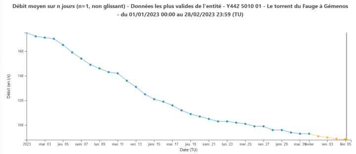 C'est un fait que cet hiver encore il n'a pas beaucoup plu, le débit de la source est passé de 175l/s le 1er janvier à 88l/s le 5 février. Il est déjà de 20% inférieur à ce qu'il était l'an dernier à la même époque (112l/s début février 2022- 88l/s en 2023).