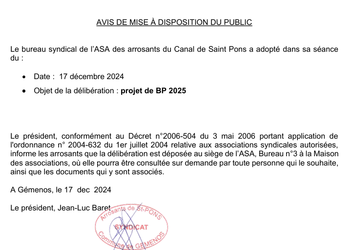 L'Assemblée 2025 des Propriétaires de l'ASA des arrosants du Canal Saint-Pons aura lieu: